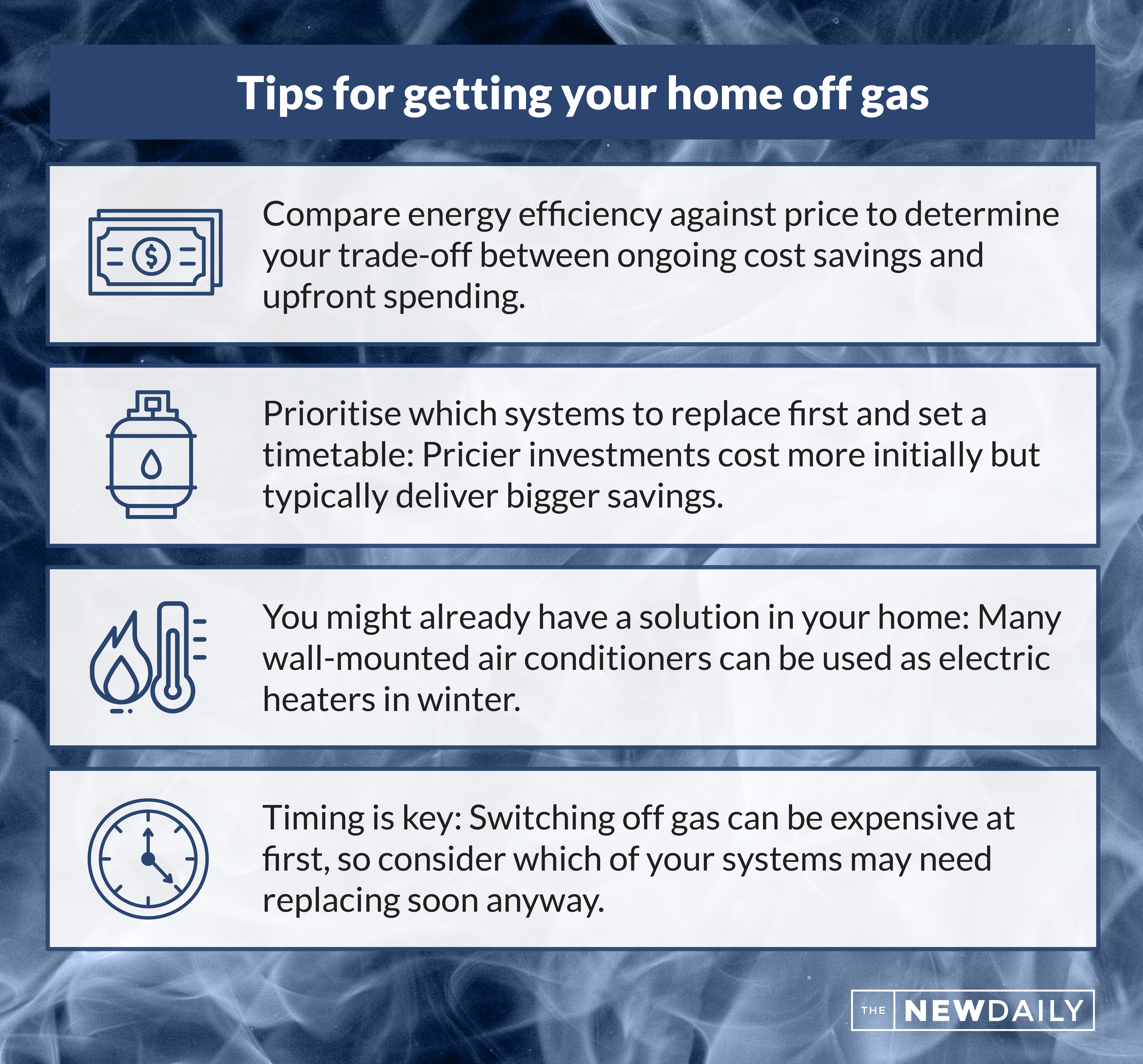 The second-biggest gas appliance in most households is the hot water system. Switching this out to electric can save hundreds of dollars a year, depending on use, Ms Rogan said.