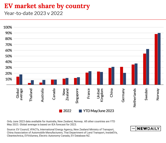 Australia continues to lag behind other nations when it comes to EV adoption, with Norway, Sweden and the Netherlands in north-western Europe having more than half of their new sales as electric vehicles.