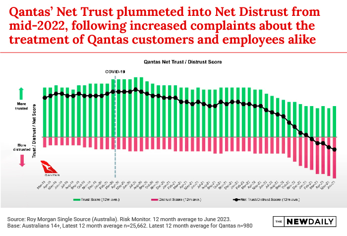 Roy Morgan, which tracks brand trust, said on Friday that “moral blindness” had driven brands like Qantas into the gutter in the minds of Australians.