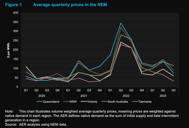 National Electricity Market (NEM) prices were under $100 per megawatt hour in most regions over the quarter, the AER said, which is a far cry from the more than $200 this time last year.