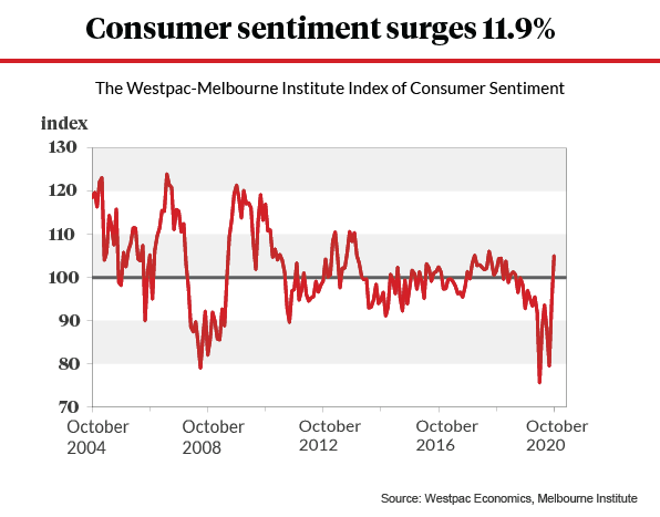 The Westpac-Melbourne Institute Index of Consumer Sentiment surged by 11.9 per cent in October to 105 points, which was 10 per cent higher than the average score over the six months before the pandemic.