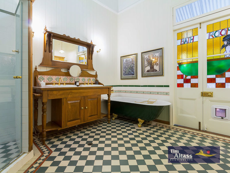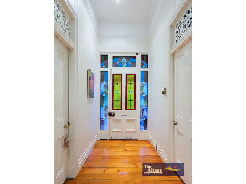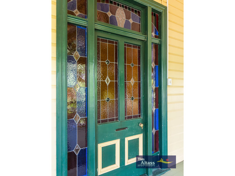 The listing says the home features "extra high ceilings, original hoop pine polished floors, beautiful stained glass features, original fretwork and a stunning kitchen".
