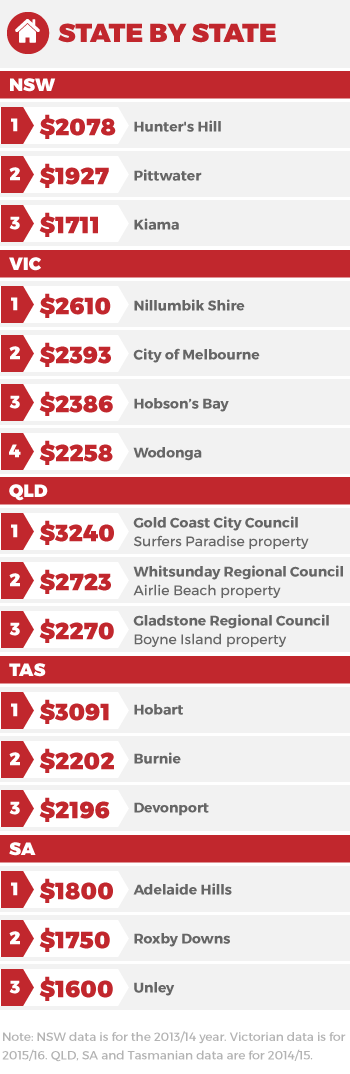 Rates in New South Wales remain at comparatively modest levels, but parts of Queensland have seen rates soar in recent years, making them the most expensive in the nation.