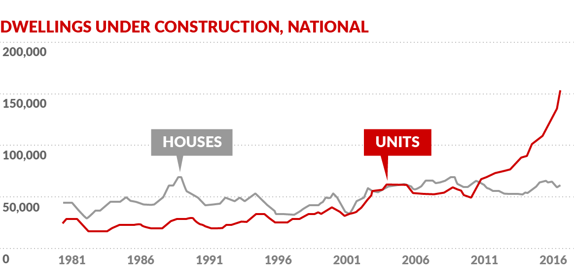 The unit price index (which includes apartments, units and flats) held steady at around 126 per cent in the last 12 months, compared to an 810 basis point increase in the previous 12 months, and 730 points the 12 months before that.