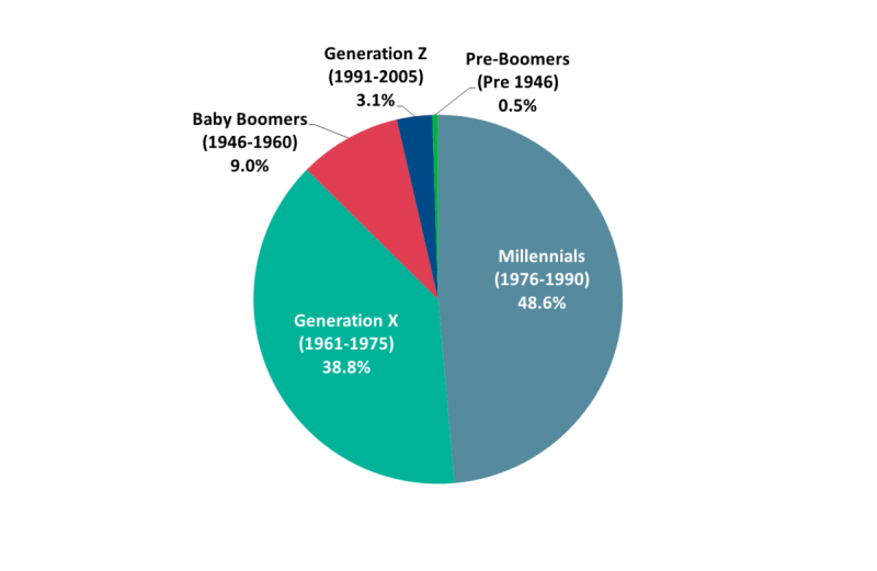 Gen X-ers were next 38.8 per cent. Together they accounted for 87.4 per cent of the market, as the pie chart below shows.