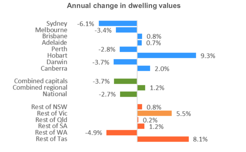 Sydney and Melbourne have led the price falls, with annual declines of 6.1 per cent and 3.4 per cent respectively.