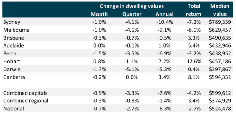 The cooling Sydney and Melbourne markets have led national home price declines, with both cities experiencing median house price falls of 11.5 per cent over the 12 months to February 28.