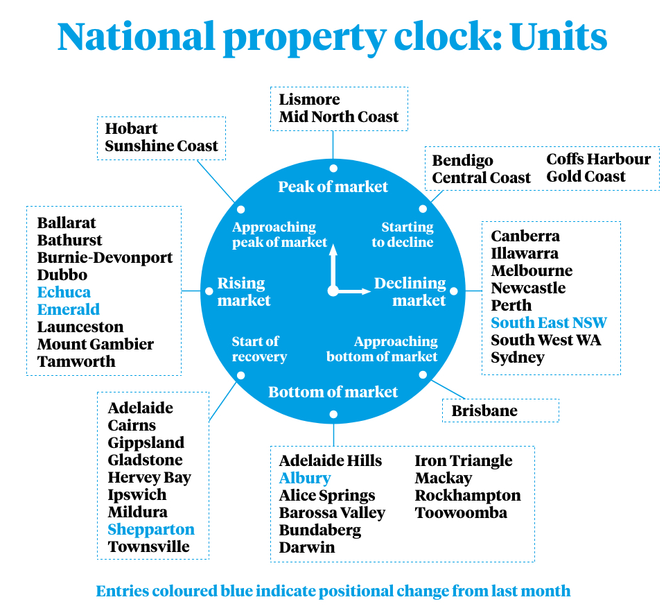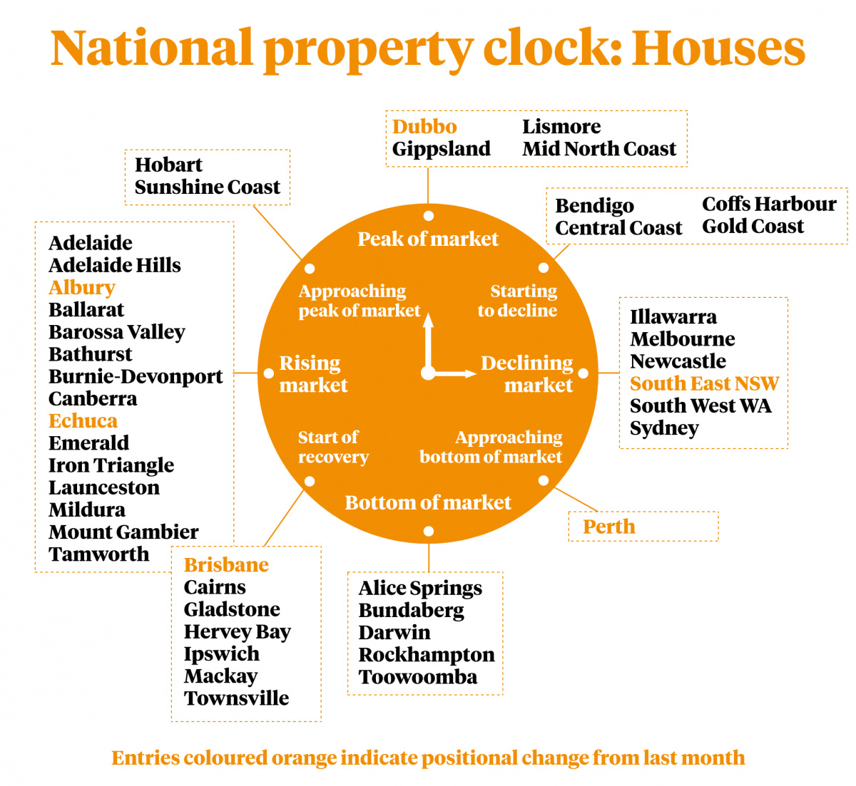 Unsurprisingly, Australia’s two most populous cities, Melbourne and Sydney, are firmly positioned at 3 o’clock – the “declining market” phase – alongside Illawarra, Newcastle, south-east Western Australia and south-west NSW.