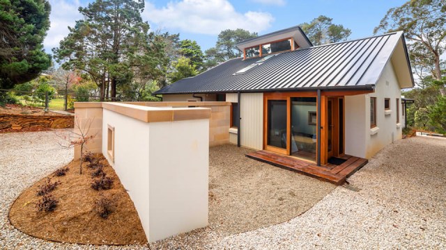 The display home in New South Wales’ Blue Mountains region has a complex system of remotely controlled electric shutters, fire resistant external cladding and fluid ventilation, balancing energy efficiency with strict fire safety standards.