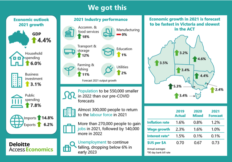 Deloitte’s new business outlook report, entitled ‘We Got This’, forecasts Australia’s economic output will rise 4.4 per cent in 2021 – driven by a 6 per cent increase in household spending and a 3.1 per cent hike in business investment.