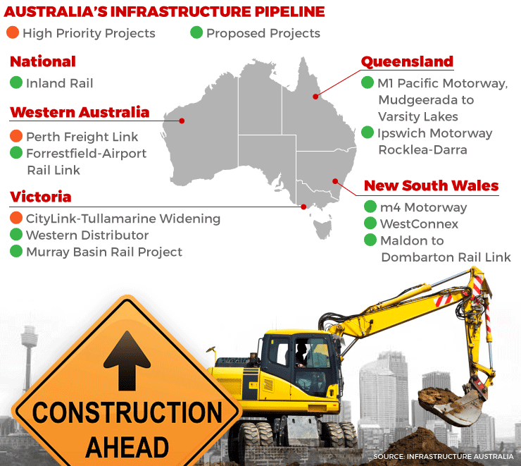 Infrastructure Australia currently lists more than 70 major projects proposed across the nation, including new roads initiatives, upgrades to capital city freeways and interstate highways, new rail links and upgrades, and runway expansions at Melbourne and Perth airports.