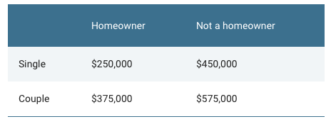 From 1 January 2017, the asset threshold will increase from $286,500 to $375,000 for homeowners. But once a couple exceeds that threshold, the couple will lose $3 a fortnight for every $1000 of assets over the threshold, up from the current taper rate of $1.50.