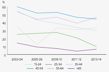 From then it falls slightly in the 55 to 64 per cent cohort then begins to rise again.