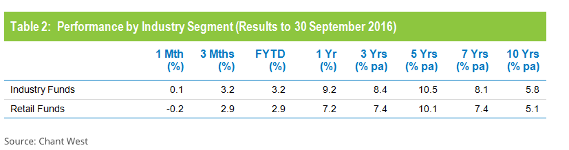The industry fund sector once again outperformed the for-profit sector, returning 3.2 per cent compared to 2.9 per cent for retail funds. Industry funds also continue to hold the advantage over the longer term, having returned 5.8 per cent per annum against 5.1 per cent for retail funds over the 10 years to September 2016, Chant West found.