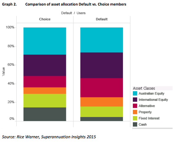 Interestingly, people who actively choose investment options are far more exposed to conservative assets than those who let the funds make the call for them, as the following chart shows.