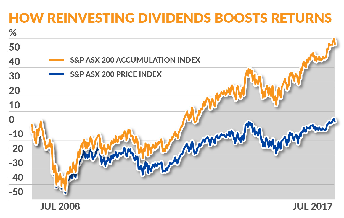 The chart demonstrates the power of compounding by showing that while the share price index is virtually flat over that time, reinvested dividends have strongly boosted returns.
