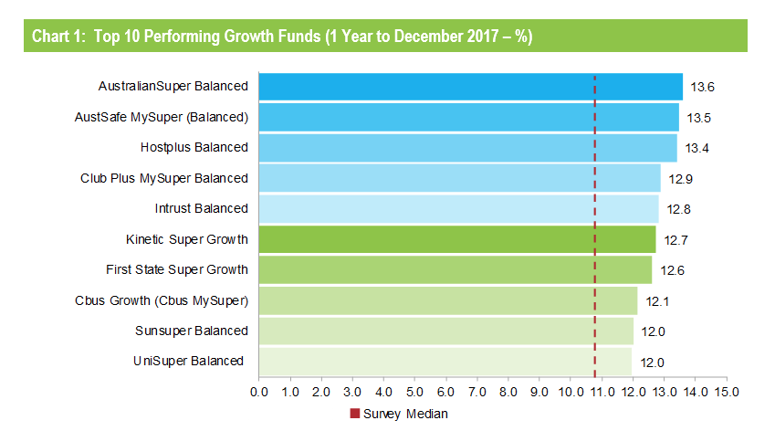 New figures from research group Chant West show that the top 10 best performing super funds outdid growth of 11.9 per cent on the Australian stock exchange over the last year. That represents the sixth consecutive year of positive returns.