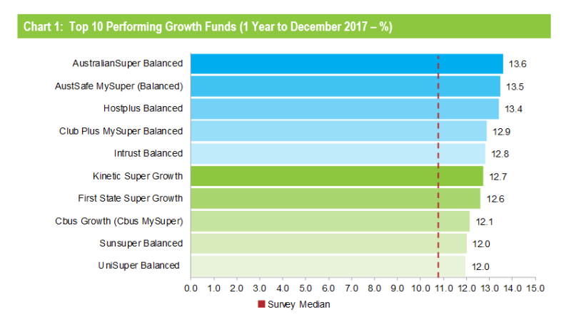 The top performer, Australian Super’s balanced option, returned 13.6 per cent while number 10, UniSuper’s balanced option, returned 12 per cent. Australian shares, meanwhile, returned 11.9 per cent for the year. Even the median figure for all funds came in just shy of 11 per cent.