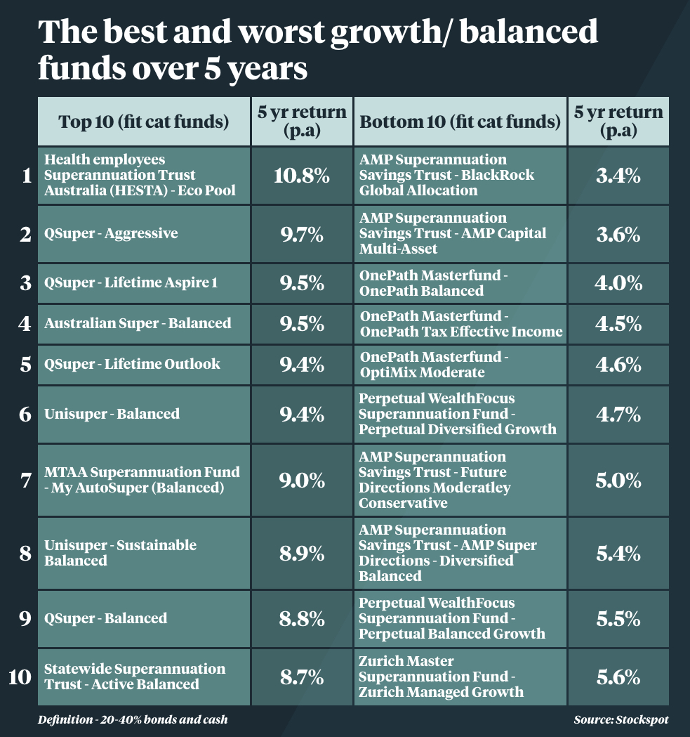 “The top-performing funds … had a relatively small (25 per cent) allocation to bonds and cash. This allowed them to return 8-11 per cent over five years,” the Stockspot report said.