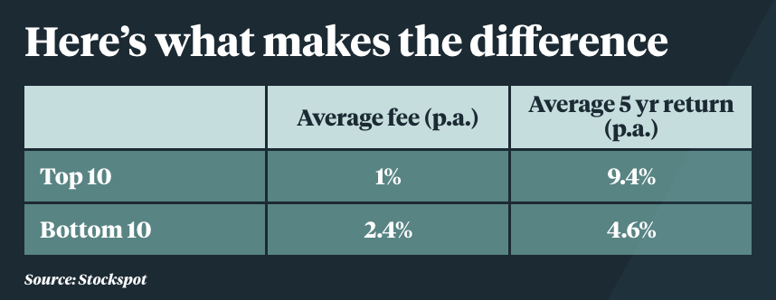 In its annual Fat Cats Report, Stockspot identified that the top-10 performing growth (or balanced) superannuation funds had average fees to members of 1 per cent and returned an average of 9.4 per cent over five years to June 30.