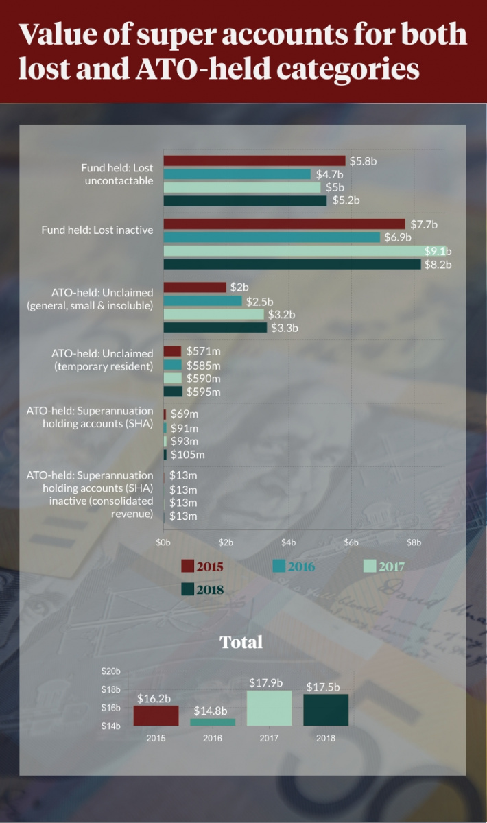 Lost monies held by the super funds fell from $5.8 billion to $4.7 billion after the legislative change, but have since climbed back to $5.2 billion.