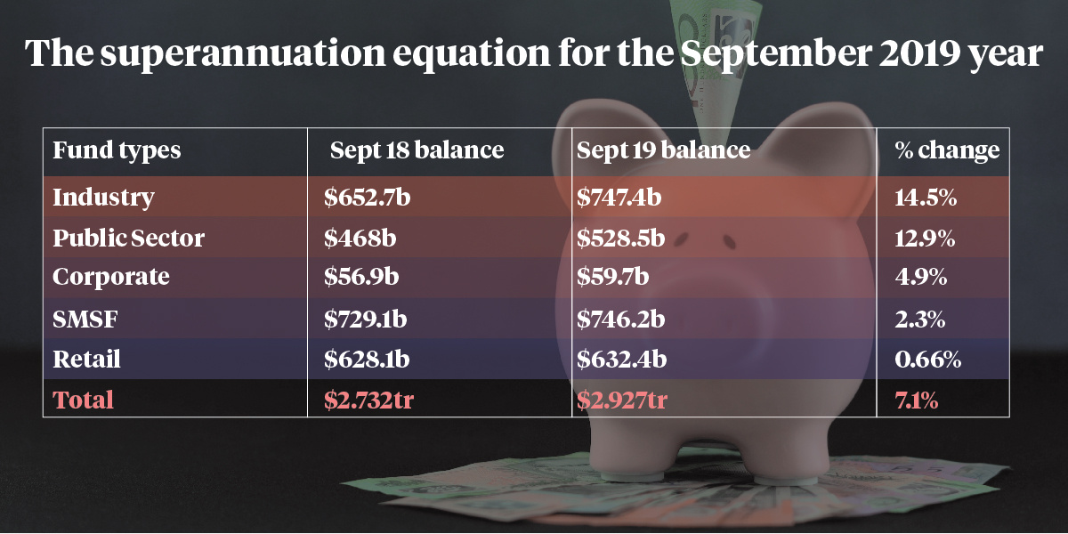 Industry fund balances increased by 14.5 per cent for the year, public sector funds rose 12.9 per cent and the overall superannuation balance for the country lifted 7.1 per cent to $2.927 trillion.