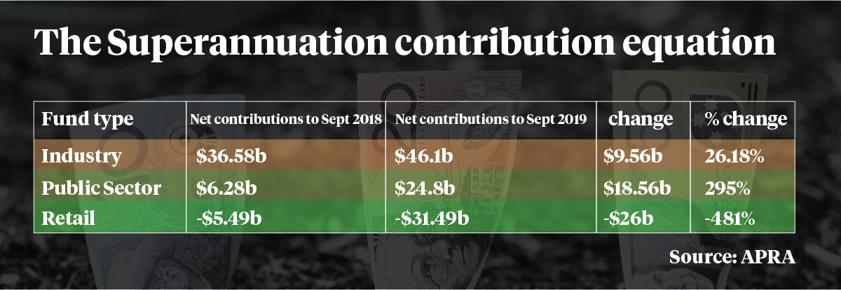 Industry funds saw a jump in contributions of $9.56 billion, or 26.18 per cent, while public sector funds experienced increases of $18.56 billion or 294 per cent.