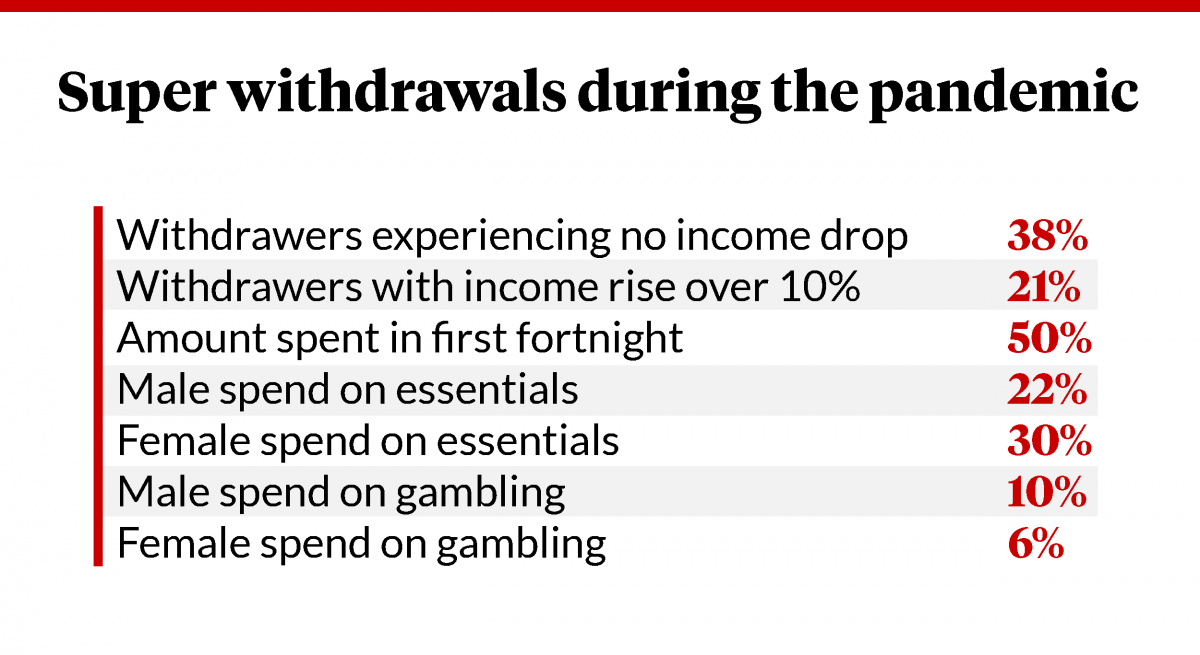An analysis of bank transaction data by economic consultants AlphaBeta and credit bureau illion found that 38 per cent of those making early withdrawals had suffered no loss in income, while 21 per cent had actually increased their income by 10 per cent or more.