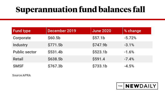 Public-sector and industry funds saw overall balances fall 1.6 and 3.1 per cent respectively, while retail funds declined 7.4 per cent and self-managed fund balances dropped 4.5 per cent.