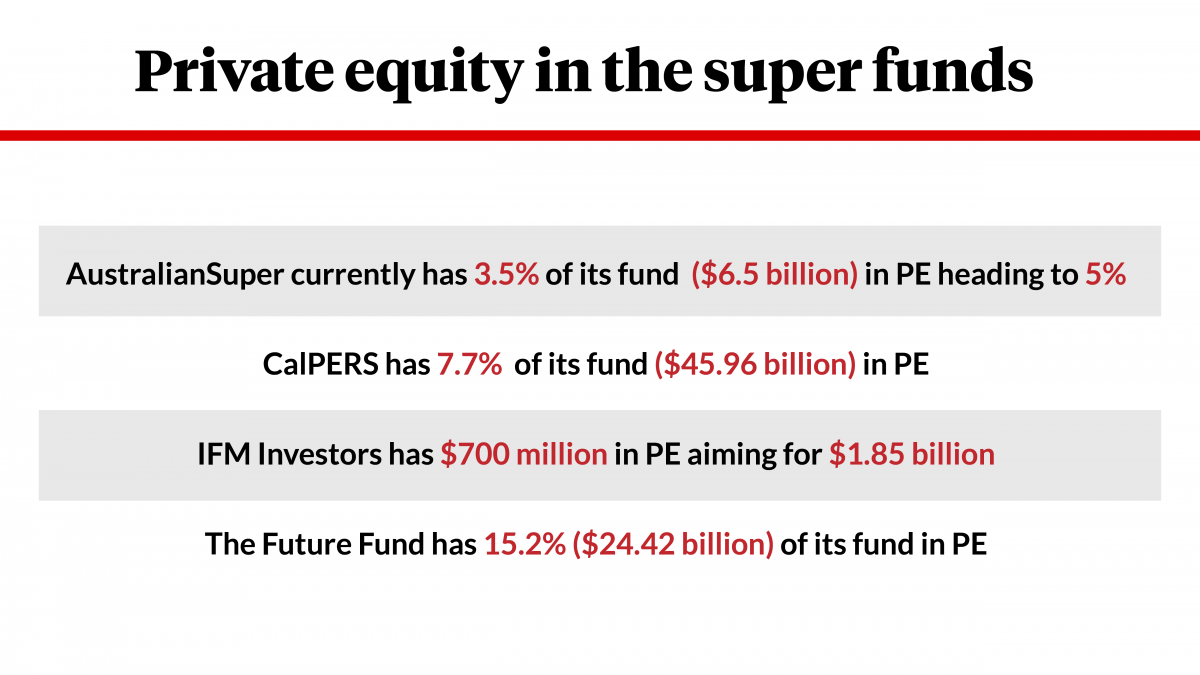 The Future Fund has 15 per cent of its investments, or $24.2 billion, in private equity, while AustralianSuper has 3.5 per cent in private equity and is aiming for 5 per cent.