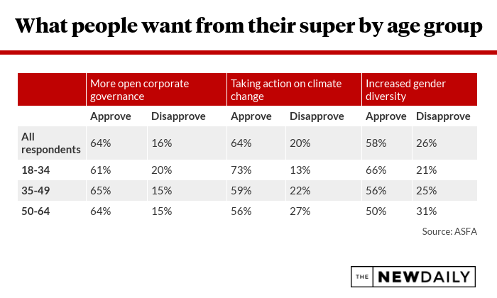 As the above chart shows, younger people increasingly want their money to improve gender diversity and support action on climate change.