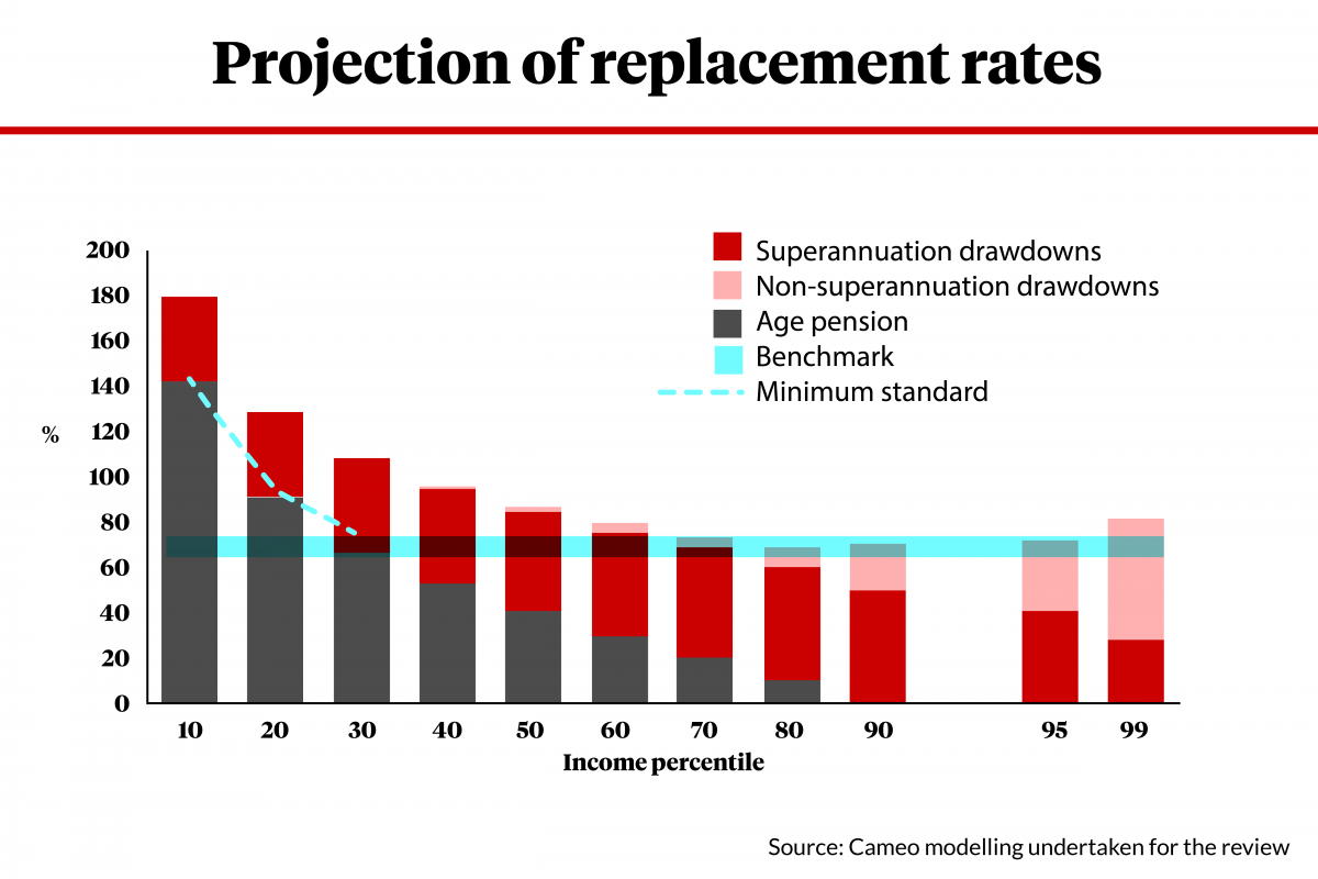 For another way of looking at where many people find themselves, the chart below demonstrates that many people retire on benefits that are not much more than 70 per cent of their working income, even where they have significant super put aside.