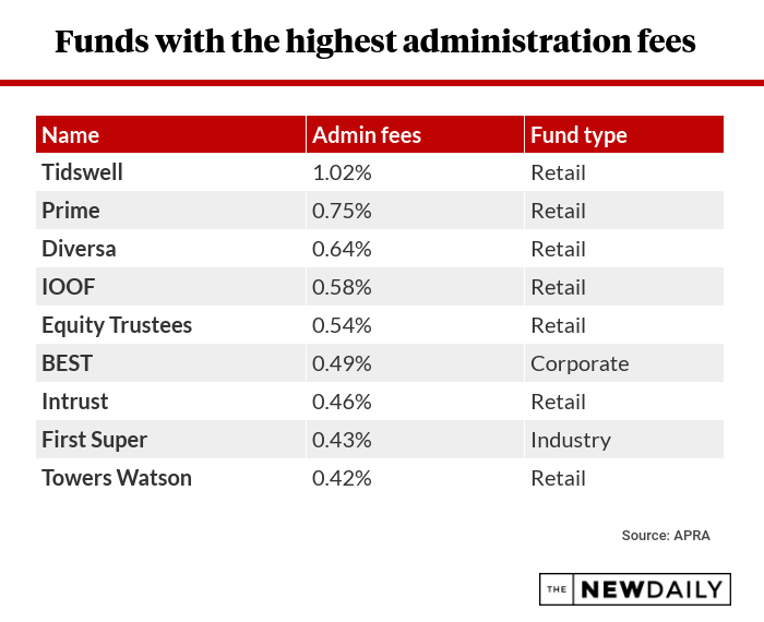 Industry funds in the same APRA table generally had admin fees of between 0.2 per cent and 0.3 per cent.