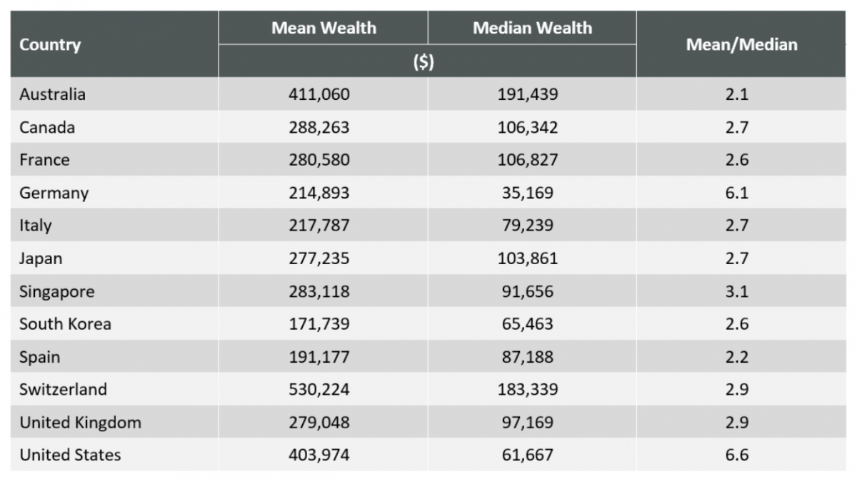 Australia, the report found, had the lowest level of inequality of 12 major countries with the mean, or average, level of wealth 2.1 times the median level. The median is the line at which half the population sit above and below.