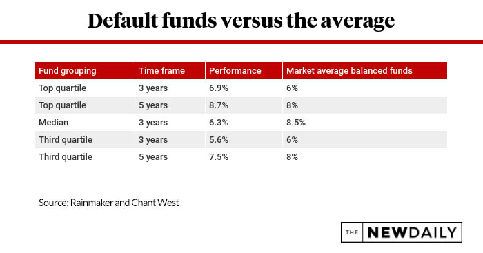 The top 25 per cent, or quartile, of default funds returned 6.9 per cent over three years and 8.7 per cent over five years.