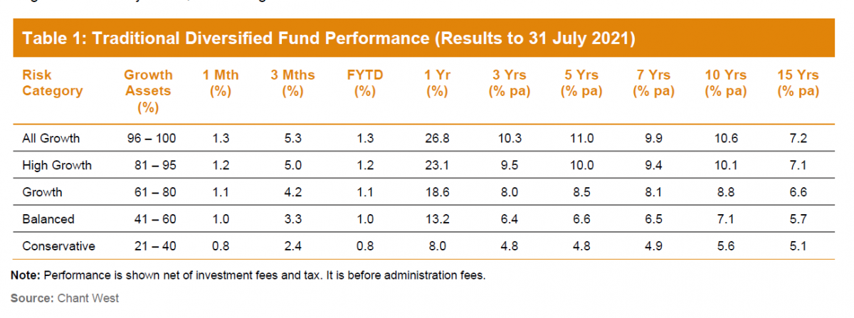 Research group Chant West on Wednesday reported that the median growth fund, which allocates between 61 per cent and 80 per cent of funds to growth assets, grew by 1.1 per cent in July on the back of gains in share and bond markets.