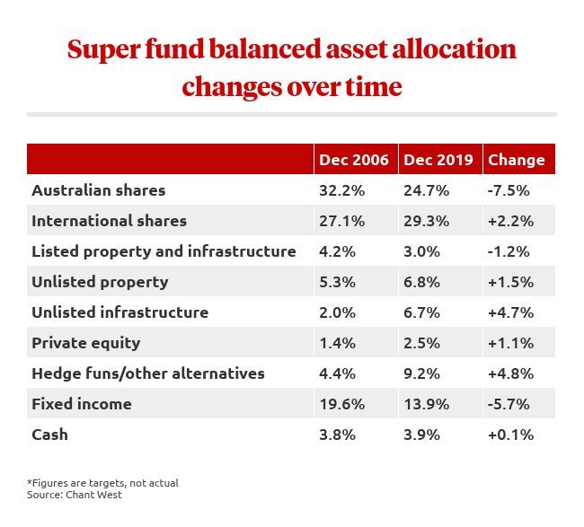 The most significant change has been in shares, particularly Australian shares, which now account for 24.7 per cent of a balanced portfolio compared to 32.2 per cent before the GFC.