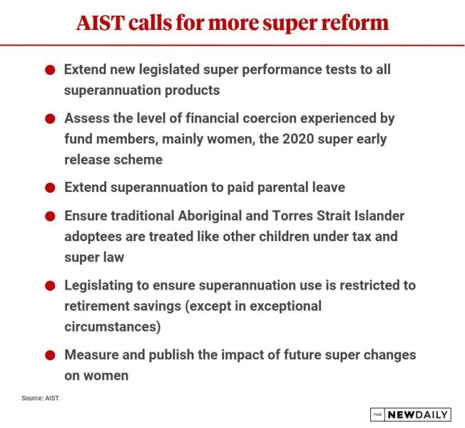 To improve gender equality, all super legislation should also be measured against its affects on women, and penalties for non-payment of superannuation guarantee requirements should be strengthened, the AIST said.