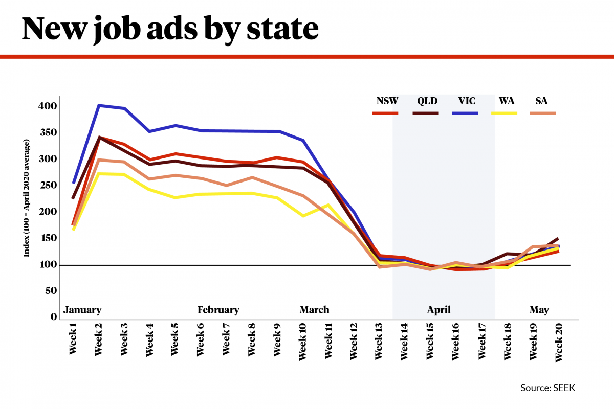In the two weeks ending May 17, new job ads posted on employment website SEEK were up 26.8 per cent on their April 2020 average.