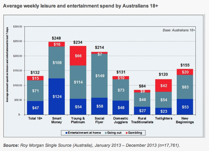 The average Australian adult spends $132 a week on entertainment, comprising $71 on going out, $47 on home entertainment and $15 on gambling.