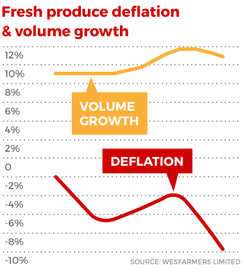 Coles CEO John Durkan told analysts on Wednesday at a Wesfarmers strategy briefing that a “raft” of fruit and vegetables hitting the market was triggering deflation and accounted for the sharp 4.1 per cent fall in prices in official figures for the March quarter.