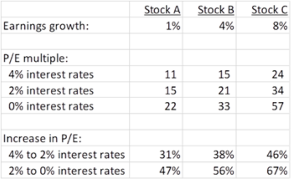 Here’s a simple, yet useful example to illustrate the magnified effect that lower interest rates have on growth stocks.
