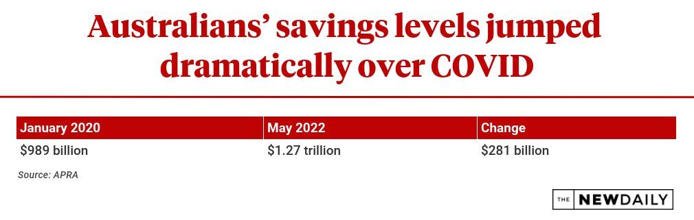 The latest figures from regulator APRA show that Australians have $1.27 trillion in their savings – which is up $281 billion, or 22 per cent, since the pandemic started.