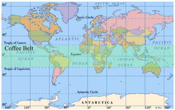 The coffee belt is where all the coffee – one of the most traded commodities in the world – is grown. Basically around the equator, it includes Brazil, Central America, Ethiopia, Kenya and Indonesia.