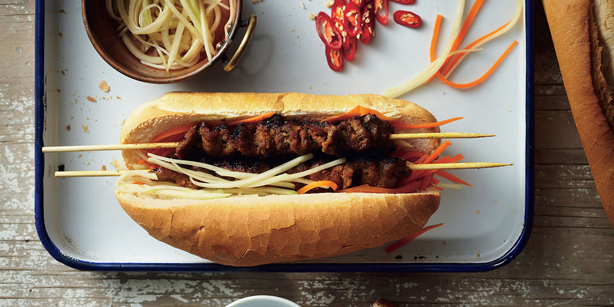 Many French buildings still stand tall today and the food has strong French influences. In the late afternoon, street-food stalls appear, chargrilling these beef skewers, served in a warm, crisp baguette with pickled vegetables.