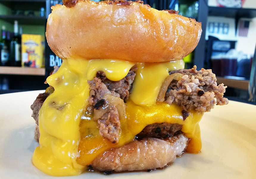 It’s a marriage made in gourmet burger heaven: a five-ounce, all-beef patty dripping with cheddar cheese and fried onions – served between a glazed doughnut.