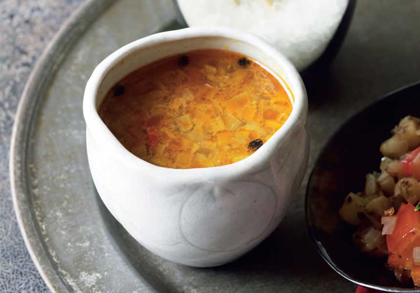 2. To make the mulligatawny soup, heat 2 tablespoons of the oil in a large saucepan over high heat, add half of the curry leaves, garlic, onion, chilli and spices and cook until fragrant, stirring frequently making sure the spices don’t burn.