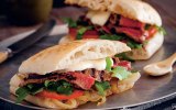 To make each steak sandwich, spread the untoasted side of the bread with onion confit, add tomato and rocket, and dress with the mayonnaise.