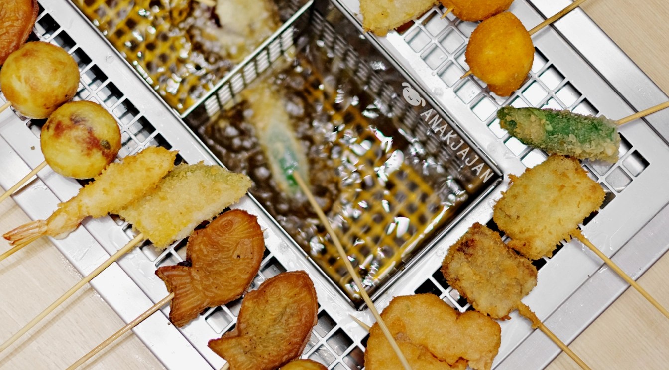 After covering the raw ingredients liberally with breadcrumbs, the skewers are dipped into the deep fryer at each table.
