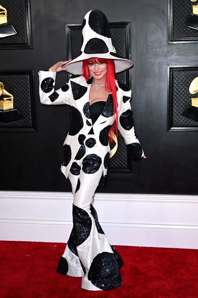 Shania Twain, ever the fashion rule-breaker, donned a loud polka dot outfit, complete with wide flare pants, a blazer, and Pharrell Williams-esque hat.